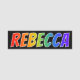 This fun, vibrant, multicolored name tag design features the common first name "REBECCA", with the letters of the name having a colourful rainbow spectrum like gradient colouring pattern, on a black coloured background. A nametag like this might be worn by a staff member, an employee, or a volunteer whose first name is Rebecca, to help identify the wearer to customers or other people. [~Z0000344]