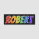 This fun, vibrant, multicolored name tag design features the common first name "ROBERT", with the letters of the name having a colourful rainbow spectrum like gradient colouring pattern, on a black coloured background. A nametag like this might be worn by an employee, a staff member, or a customer service representative named Robert, to help identify the wearer to others. [~Z0000344]