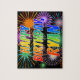 This lively and vibrant birthday-themed jigsaw puzzle design has the message "HAPPY BIRTHDAY, RYAN" having a colorful rainbow spectrum inspired gradient pattern, and a fun bursting celebratory fireworks inspired background pattern. A colorful puzzle like this might be used to send a birthday greeting message to somebody named Ryan. [~Z0000465]