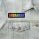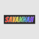 This fun, vibrant, multicolored name tag design features the common first name "SAVANNAH", with the letters of the name having a colourful rainbow spectrum like gradient colouring pattern, on a black coloured background. A nametag like this might be worn by a staff member, an employee, or a customer service representative named Savannah, to help identify the wearer to customers or other people. [~Z0000344]