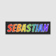 This fun, vibrant, multicolored name tag design features the common first name "SEBASTIAN", with the letters of the name having a colourful rainbow spectrum like gradient colouring pattern, on a black coloured background. A nametag like this might be worn by a volunteer, a customer service representative, or an employee who is named Sebastian, to help identify the wearer to customers or other people. [~Z0000344]