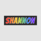This fun, vibrant, multicolored name tag design features the common first name "SHANNON", with the letters of the name having a colourful rainbow spectrum like gradient colouring pattern, on a black coloured background. A nametag like this might be worn by an employee, a customer service representative, or a volunteer whose first name is Shannon, to help identify the wearer to customers or other people. [~Z0000344]