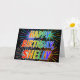 This fun, vibrant, multicolored birthday greeting card design features the message "HAPPY BIRTHDAY," and the common first name "SHELLY" with the letters having a colourful rainbow spectrum like gradient colouring pattern. The background of the front also features a colourful pattern inspired by the look of bursting celebratory fireworks. The inside features a customised greeting message, or could perhaps be cleared and left blank if a message is to be written by hand instead. A greeting card like this could be a fun way to celebrate the birthday of somebody named Shelly. [~Z0000350]
