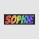 This fun, vibrant, multicolored name tag design features the common first name "SOPHIE", with the letters of the name having a colourful rainbow spectrum like gradient colouring pattern, on a black coloured background. A nametag like this might be worn by a staff member, a volunteer, or an employee whose given name is Sophie, to help identify the wearer to others. [~Z0000344]
