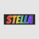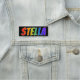 This fun, vibrant, multicolored name tag design features the common first name "STELLA", with the letters of the name having a colourful rainbow spectrum like gradient colouring pattern, on a black coloured background. A nametag like this might be worn by a customer service representative, a staff member, or an employee named Stella, to help identify the wearer to customers or other people. [~Z0000344]