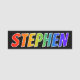 This fun, vibrant, multicolored name tag design features the common first name "STEPHEN", with the letters of the name having a colourful rainbow spectrum like gradient colouring pattern, on a black coloured background. A nametag like this might be worn by a customer service representative, an employee, or a volunteer who is named Stephen, to help identify the wearer to customers or other people. [~Z0000344]