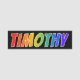 This fun, vibrant, multicolored name tag design features the common first name "TIMOTHY", with the letters of the name having a colourful rainbow spectrum like gradient colouring pattern, on a black coloured background. A nametag like this might be worn by a staff member, a volunteer, or an employee who is named Timothy, to help identify the wearer to others. [~Z0000344]