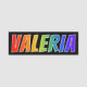 This fun, vibrant, multicolored name tag design features the common first name "VALERIA", with the letters of the name having a colourful rainbow spectrum like gradient colouring pattern, on a black coloured background. A nametag like this might be worn by a volunteer, a staff member, or an employee whose first name is Valeria, to help identify the wearer to others. [~Z0000344]