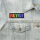 This fun, vibrant, multicolored name tag design features the common first name "VALERIA", with the letters of the name having a colourful rainbow spectrum like gradient colouring pattern, on a black coloured background. A nametag like this might be worn by a volunteer, a staff member, or an employee whose first name is Valeria, to help identify the wearer to others. [~Z0000344]
