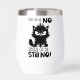 A funny, sarcastic black-and-white graphic design showcases a black cat with frazzled fur and a scowling expression. The black handwritten text says, "First of all, no. Second of all, still no!" Available on a wide variety of products, this design makes a perfect gift for cat lovers.
