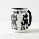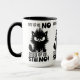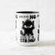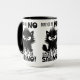 A funny, sarcastic black-and-white graphic design showcases a black cat with frazzled fur and a scowling expression. The black handwritten text says, "First of all, no. Second of all, still no!" Available on a wide variety of products, this design makes a perfect gift for cat lovers.