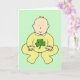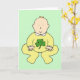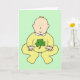 A cute cartoon baby in a lemon outfit with a shamrock on the front set against a flat green background.