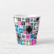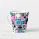 A bold, patterned latte mug with a funny caption for a tea or coffee lover. Use "Personalise this template" to change the "First Things First Tea Break!" text, if desired. Busy with decorative tiles of various sizes and varied patterns. Black and white designs on black, cream, magenta and blue backgrounds. All patterns were designed and drawn by me and are inspired by Celtic and Islamic design.