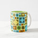 A bold, patterned mug with a funny caption for a tea or coffee lover. Use "Personalise this template" to change the "First Things First Tea Break!" text, if desired. Busy with decorative tiles of various sizes and varied patterns. Black designs on faded orange, green, blue and yellow backgrounds. All patterns were designed and drawn by me and are inspired by Celtic and Islamic design.