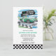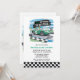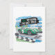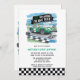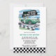A charming watercolor illustration of a green race car with the number 01, symbolising a young racer’s first milestone. The car is parked on a race track with a chequered flag waving nearby. Surrounding the scene are racing tires, a helmet, and a white building in the distance, set against a bright blue sky with soft clouds. Perfect for a boy’s birthday celebration, invitations, or decorations.