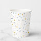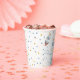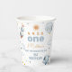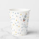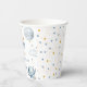 Outer space or first trip around the sun first birthday paper cup featuring a sun, moon, stars, spaceship and astronaut in an orange and gray blue color.