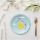 Simple, modern, cute yellow and pink First Trip Around The Sun 1st birthday paper plate for baby-girl party.