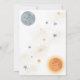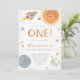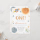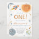 Invitation features space design, sun, moon, rocket, stars, and planet earth. Perfect for a first birthday theme.