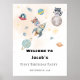 Celebrate your little one’s first birthday with this adorable “First Trip Around the Sun” outer space themed design This charming design features cute woodland animals a raccoon and a bear dressed as astronauts, surrounded by watercolor rockets, planets, stars, and a dreamy galaxy background. Perfect for a boy’s 1st birthday, this playful space theme adds a fun and imaginative touch to your celebration and is sure to impress your guests.