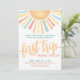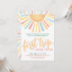 Celebrate your little one's First Trip Around the Sun with this bright and cheerful 1st birthday party invitation. At the top, "First Trip" is highlighted in bold script calligraphy, setting the tone for a joyful celebration. A big sun with vibrant rays in yellow, orange, red, teal, and blue beams down, creating a fun and colourful theme.