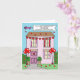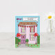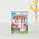 A simple illustration of a pink house decorated with heart shaped balloons and bunting. There is a plane flying over the house that has a banner behind it, which says 'Happy first Valentine's Day as a couple to a special daughter and son in law'.