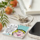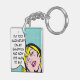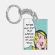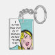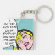Oh, the humanity! This comic book inspired keychain design pokes fun at first world problems. It features an emotionally distraught young woman and a speech bubble that reads, "I put too much stuff on my sandwich and now it's hard to eat." The woman and speech bubble are on an aqua and white polka dot background. Let's hope she can find the inner strength to go on!