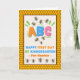 Custom front, add a name, Happy First Day of Kindergarten, paper greeting card with bees and honey comb. The bees are gathering around the letter B on the cover. Cute Bee verse inside. Change or add to the text on the cover and inside as desired. Art, image, and verse © Shoaff Ballanger Studios, 2023.