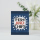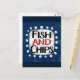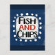 A fun and cute typographic message design that says "Fish And Chips". It has black and red text on a white rectangle with funky, playful white dots surrounding it, all on a blue background.
