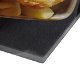 A close up photograph of Fish and Chips printed on a glass chopping board.