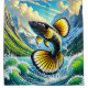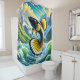 This shower curtain has a guppy fish jumping out of the water pictured on it.