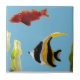 Fishes swimming in the sea amongst seaweed, with an Angel fish in the centre. From my original glass painting. Copyright Annabel Potter