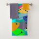 This towel set has a gold washcloth, a purple hand towel, and a bath towel with a design of a school of fish in green, blue, orange, yellow, red, pink, and blue-green swimming in the ocean.