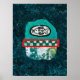 A fish drawing sits atop collaged aqua and messy painted collage elements with a teal and white chequerboard strip bringing them together. All pieces sit on a deep navy blue scratched background.