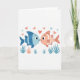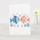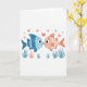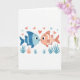 This card shows two sweetly drawn fish meeting in a gentle kiss at the center of a white background, their big bright eyes turned toward each other like they can’t look away 🥰. One fish is blue with light stripes and darker fins and tail, and the other is a warm peach tone with similar striping, creating a soft contrast that feels tender and friendly. Their small upturned smiles and close noses make the moment feel intimate without being overstated. Above and around them, small floating hearts drift like bubbles in coral pink, red ❤️, and soft teal, spreading across the upper half of the scene. Below the pair, simple coral-like shapes rise from the bottom edge in matching blues and peaches, gently framing the couple like an underwater garden. There’s no text crowding the illustration; the open white space leaves room for a short message, with a small line of lettering best placed near the bottom in a light teal or coral to match the hearts. The overall look stays smooth and minimal, with flat color areas and no heavy texture, keeping your eye on the fish and the hearts surrounding them. A cluster of teal and coral hearts hovers just above their touching mouths while the blue-and-peach sea plants curl along the lower border.