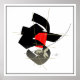 Digital collage illustration with pen and ink drawing of a little fish swimming among abstract sticks and kelp. Red, black and taupe colors with an Asian influence. Paired with Little Bird Fly. Artist, Margaret Loftin Whiting.