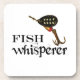 Funny fishing coaster for all fishermen and fisherwomen. Fish Whisperer in text with a full color fishing lure near the top.
