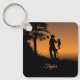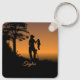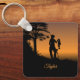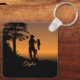 Design of a woman with fishing gear holding a huge fish. It is the end of the day and the sun is setting while she walks home down a grassy slope and stops near a tree.