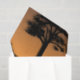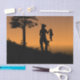 Design of a woman with fishing gear holding a huge fish. It is the end of the day and the sun is setting while she walks home down a grassy slope and stops near a tree.