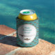 Fishing retirement party beer / can cooler with text. Trout fish images and rod and reel decorate either can or bottle holders. Personalise with big letters saying, "Happy retirement (name)", or your choice of text - it will print on both sides. A rod and reel image and a trout image is printed beneath the wording. The background is a pattern of swimming speckled trout over a turquoise colour.