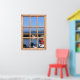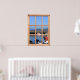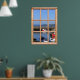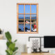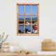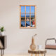 This view of bright fishing boats from a wood window frame is the companion of the other Boats in the Harbor window poster. It shows a scene at a pretty fishing harbour where the painted boats await their next sailing. Buy the posters as a pair and display this one to the left (as you look at the wall) of the other one to create the appearance of a real view out of 2 windows on your wall!