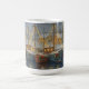 Celebrate the season by the sea with this elegant coastal Christmas mug. A row of fishing boats, decorated with festive wreaths and glowing lights, rests in a snowy harbor as a Christmas tree sparkles in the distance.