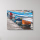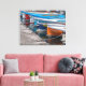 A beautiful view of fishing boats in a row printed on a canvas.