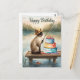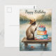 Celebrate a bold and stylish birthday with this glamourous watercolor illustration of a fierce, high-fashion Siamese cat dressed in a chic fishing outfit. She stands on the dock in a confident power pose, holding her three trophy fish with attitude. Luxury fishing gear surrounds her, along with a small elegant cupcake topped with a gold candle for a birthday touch.