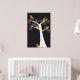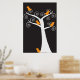 Five adorable abstract orange birds hang out in a white tree against a black background on a poster