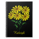 Five yellow flowers on black personalised notebook. Customise with your own text. Great gift idea.