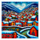 A.I .assisted print of a vibrant, surreal village within a fjord landscape is set against a starry night sky, with colourful houses blanketed in snow.