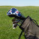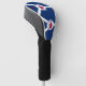 Golf driver cover with flag of city of Fort Wayne, Indiana; blue and white flag and with red blockhouse in the center and three illustrations in the blue field - illustration of Native American’s head, French fleur-de-lys and British lion