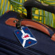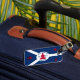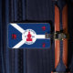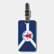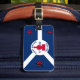 Luggage Tag with flag of city of Fort Wayne, Indiana; blue and white flag and with red blockhouse in the center and three illustrations in the blue field - illustration of Native American’s head, French fleur-de-lys and British lion