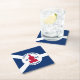 Paper coaster with flag of city of Fort Wayne, Indiana; blue and white flag and with red blockhouse in the centre and three illustrations in the blue field - illustration of Native American’s head, French fleur-de-lys and British lion