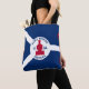 Tote bag with flag of city of Fort Wayne, Indiana; blue and white flag and with red blockhouse in the centre and three illustrations in the blue field - illustration of Native American’s head, French fleur-de-lys and British lion